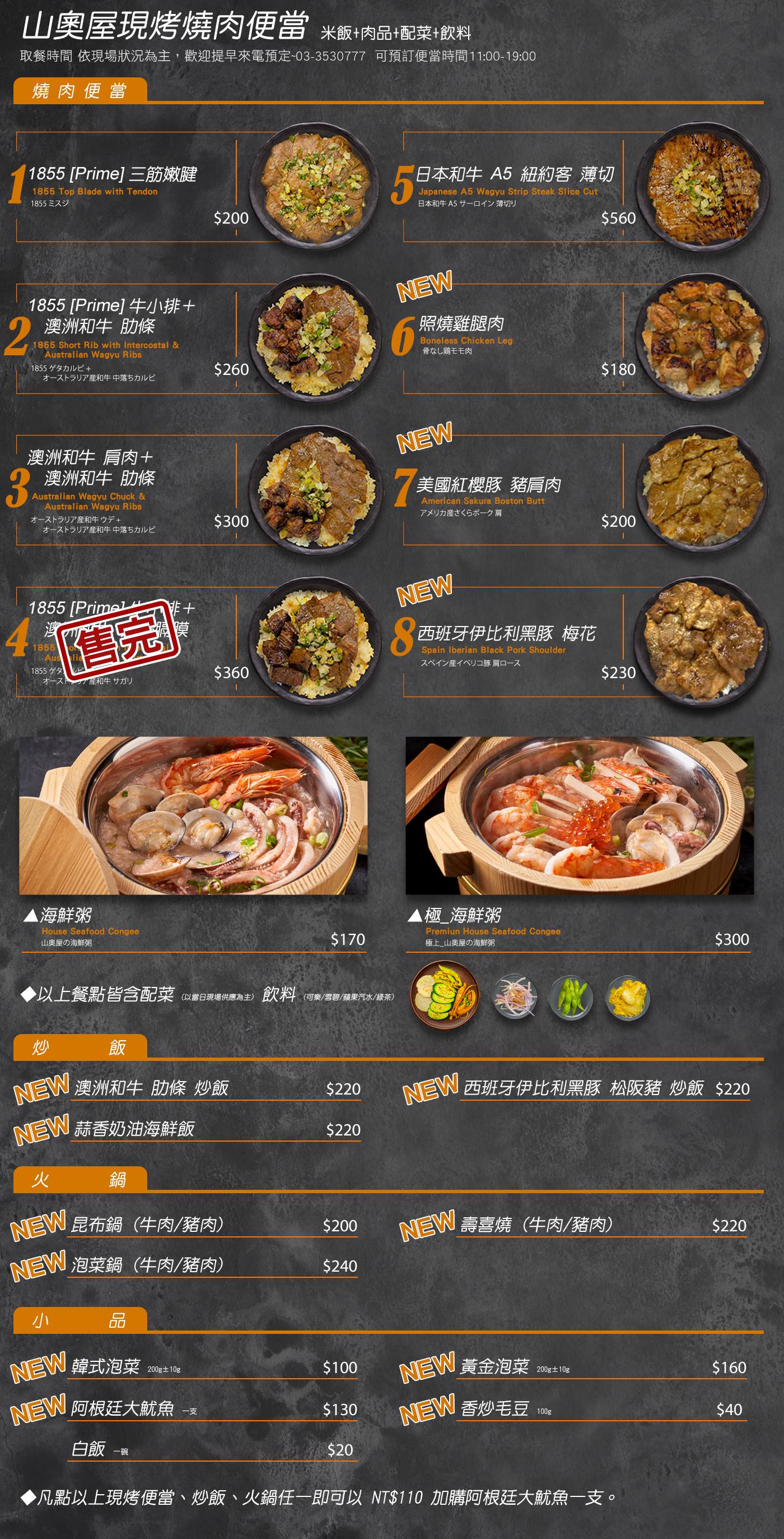 禁止內用期間限定,山奧屋提供現烤燒肉便當,以及海鮮粥外帶。